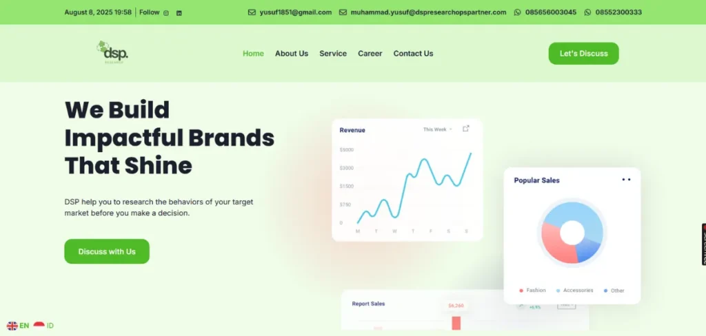 Kami menghadirkan website profesional, cepat, dan mobile-friendly dengan desain yang modern, menarik serta strategi yang tepat untuk meningkatkan kredibilitas dan penjualan bisnis Anda.